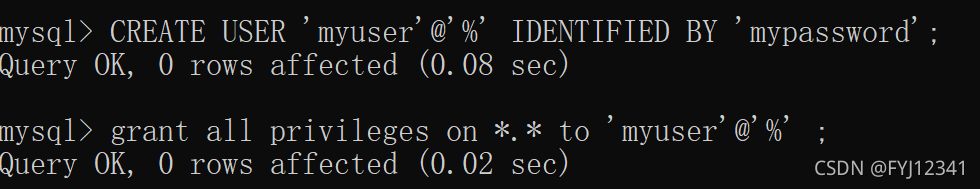 登陆成功后让对方创建一个用户并对这个用户进行授权,我和对方用的都是是mysql 8.0版本,这个版本要先创建用户再授权,与之前的版本不一样。