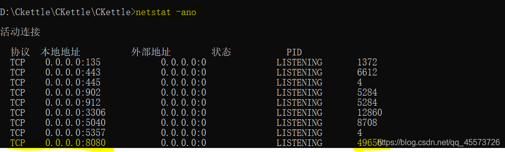 可以清楚的看到被占用的端口的进程是49656,然后使用 tasklist 查看具体的任务