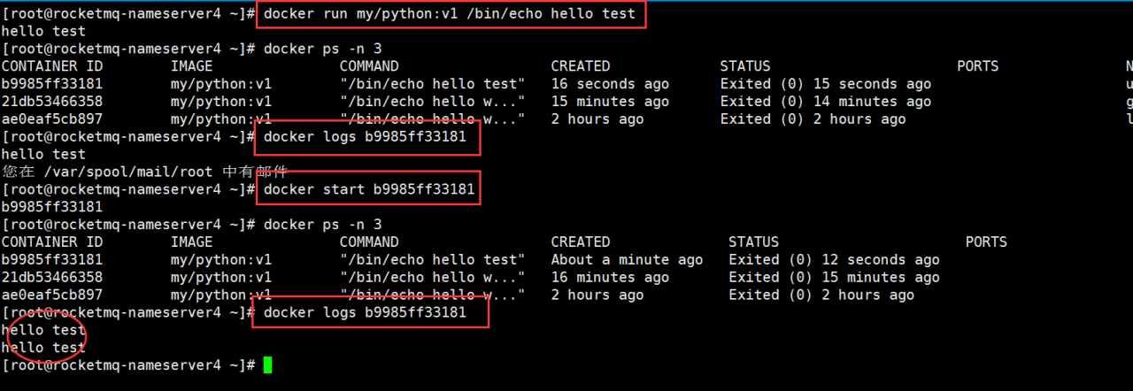 [root@rocketmq-nameserver4 ~]# docker run my/python:v1 /bin/echo hello test