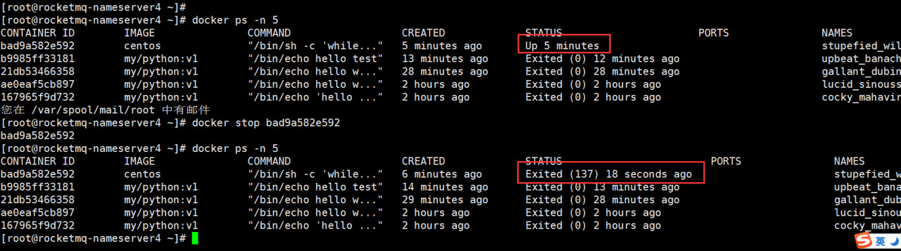 启动之后,我们使用docker ps -n 5查看容器的信息