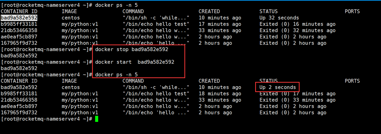 可以用"docker ps -n 5 "看一下最新前5个的container,第一个就是刚刚执行过的container,可以再次执行一遍:docker start container_id