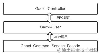 复制代码PS:为什么要将UserService放在Gaoxi-Common-Service-Facade中? 在这个项目中,Gaoxi-User是UserService服务的提供方,Gaoxi-Controller是UserService服务的引用方。由于二者并不在同一个系统中,所以必须要借助于Dubbo来实现远程方法调用。而Dubbo发布服务和引用服务的时候,都是根据服务的接口标识服务的,即服务引用方和发布方都需要使用服务的接口,因此需要将服务的接口放在所有项目共同依赖的基础模块——Gaoxi-Common-Service-Facade中。