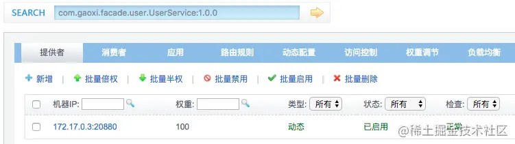 当我们搜索UserService服务后,可以看到,该服务的提供者已经成功发布了服务:
