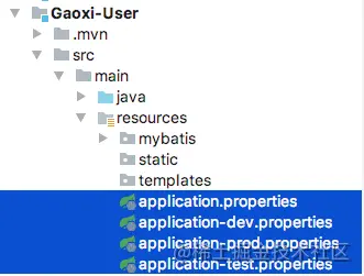 复制代码在子项目中创建配置 分别为dev环境、test环境、prod环境创建三套配置,application.proerpties中存放公用的配置。