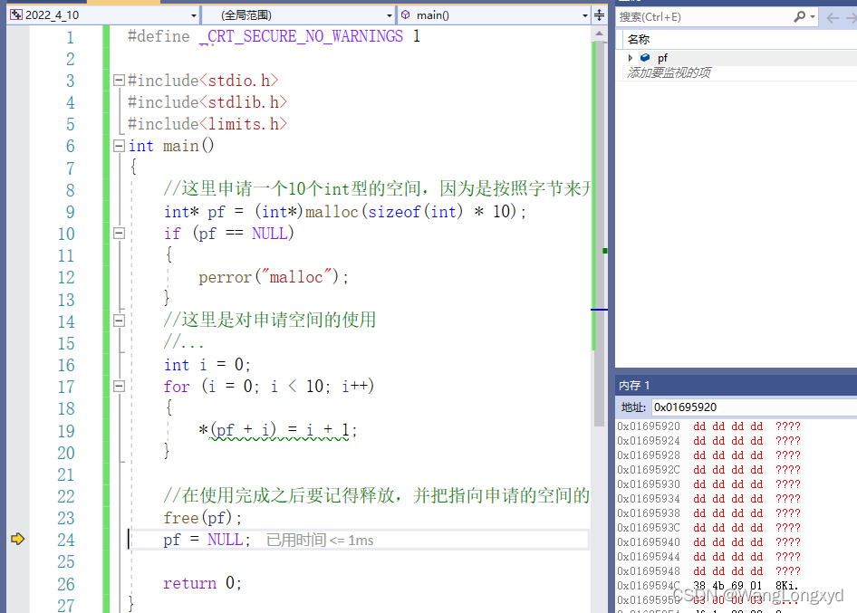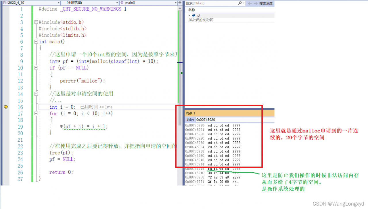 //这里申请一个10个int型的空间,因为是按照字节来开辟,所以用到了sizeof操作符