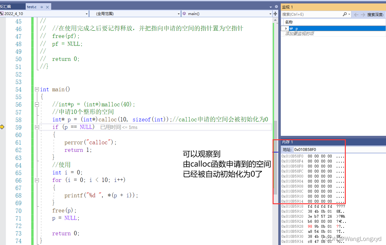 int* p = (int*)calloc(10, sizeof(int));//calloc申请的空间会被初始化为0