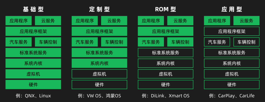 主要以QNX、Linux、Andriod为代表,涉及到车辆的硬件、虚拟机、系统内核等全方位的修改与打造。