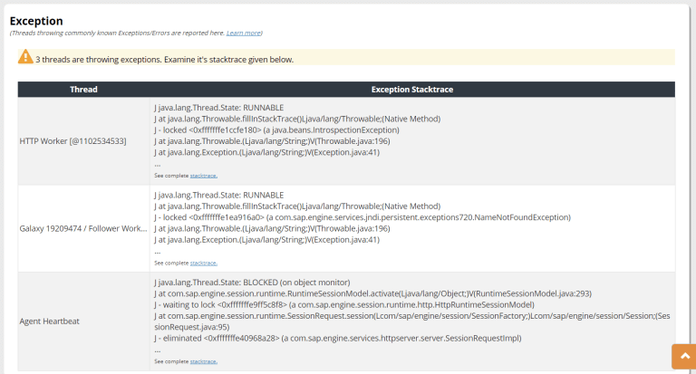 您可能会注意到,本节报告了所有在堆栈跟踪中具有“异常”或“错误”的线程。 如果本节中报告了任何线程,则应考虑调查那些线程堆栈跟踪以确定问题的根源。