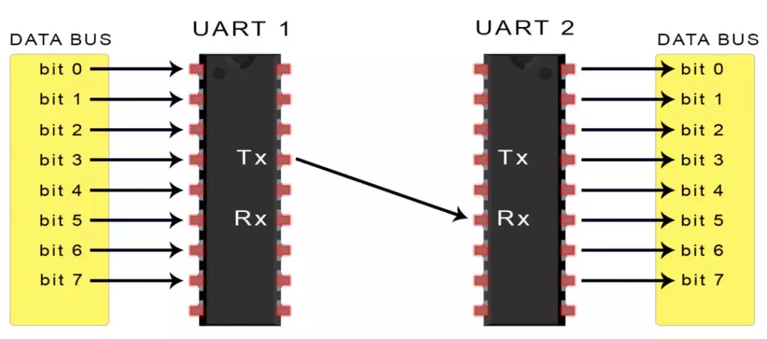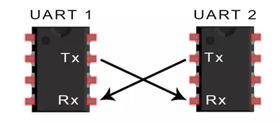 通用异步收发器,就是常说的串口通信,常常用在异步通信并且是一种全双工的通信方式,不需要严格的时间限制,两个设备之间连线简单,往往只需要将RX,TX端交叉相连即可。现实中利用面很广,多用于调试,在以后学习Linux驱动开发时是非常重要的。uart的连接过程如下图,很简洁明了。