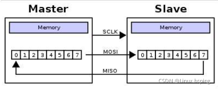 这是一种同步全双工的传输方式,他的连线是这三种通信方式里面最多的,有一个clk串行时钟、MOSI主设备输出、MISO主设备输入、cs从设备片选。他的缺点就是每个从设备都需要有一个cs口用来对其在传输时进行选择。在数据传输时还需要考虑传输时是低电平有效还是高电平有效、第一个下降沿有效还是第二个下降沿有效,相当于有四种传输方式。内部spi通信相当于一个环路,输出数据后又读入数据: