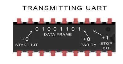 由图可见,数据在总线和uart之间还是并行传输的,但是两个设备之间的uart之间就采取了单线的传输,在传输的前,还会自动的添加起始位、奇偶校验位、停止位。具体的传输过程如下图: