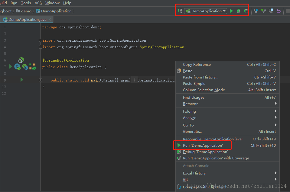 1.项目加载完毕之后打开启动器DemoApplication右键run可直接启动项目,或者右上方直接启动DemoApplication
