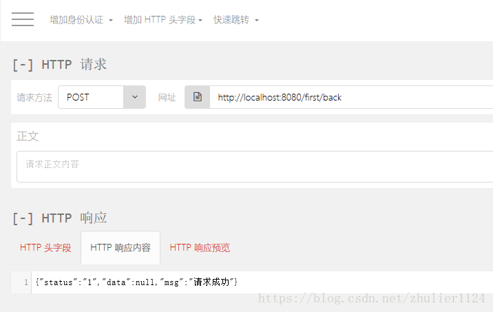 打开RESTClient浏览器插件测试json数据返回正常(如没有插件可更改请求为get接收,直接在浏览器请求back路径即可返回json数据),输入 http://localhost:8080/first/back 返回我们设定的 msg:请求成功