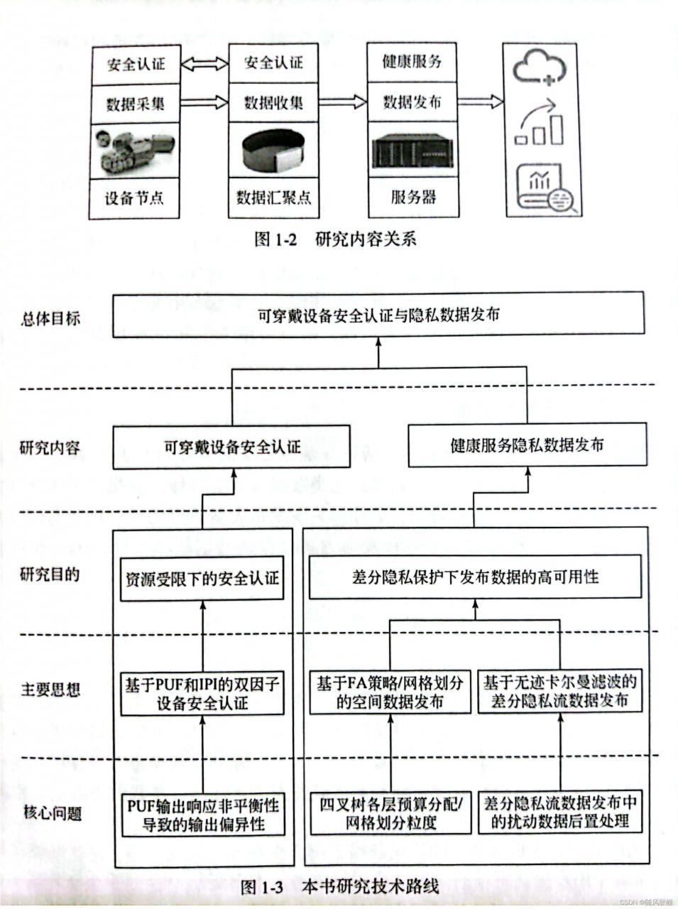 面向健康服务的可穿戴设备的用户数据至关重要,轻则涉及个人隐私,重则关乎人身安危,解决可穿戴设备安全问题迫在眉睫。但可穿戴设备资源受限,在安全认证方面,现有研究成果虽有超轻量化认证机制,但这些机制只针对设备的物理属性进行认证,保证不了用户的私有属性;在隐私保护方面,现有研究成果没有针对可穿戴设备数据特点,在数据安全性与可用性上达不到理想效果。因此,针对可穿戴设备及其数据特点,研究安全认证和隐私保护的新机制,对推动可穿戴设备的深度推广和普及应用具有重要理论意义及应用价值。以下研究内容关系和技术路线分别如图1-2和图1-3所示。