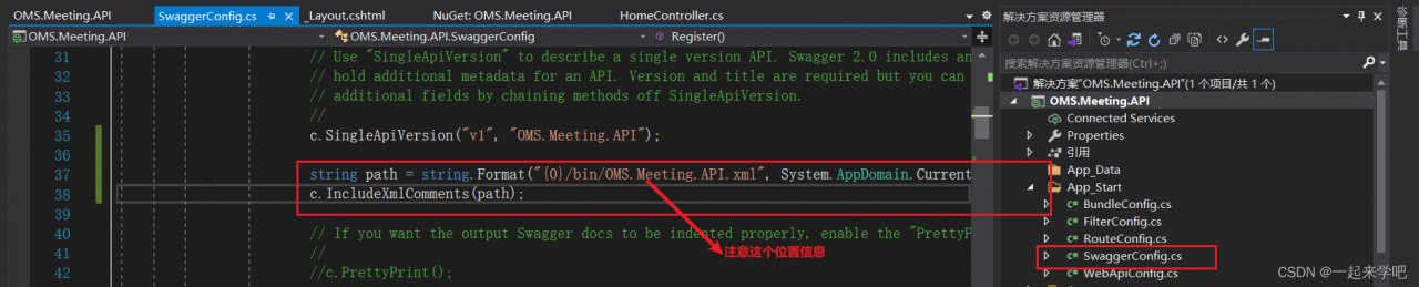 安装完成后,在文件夹App_Start自动生成一个配置文件 swagger.config。在这个文件中可以设置多版本控制、定义扩展功能、自定义显示ui的样式脚本、可以配置过滤、权限、为接口添加xml注释等,下面将演示如何添加xml注释,添加代码如下: