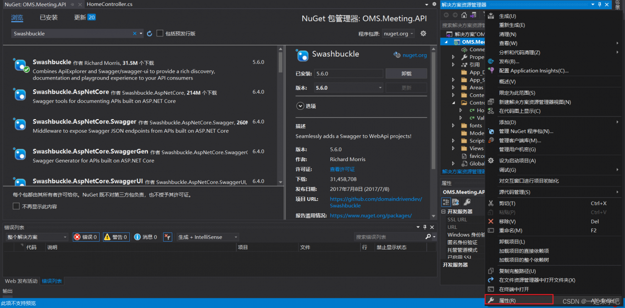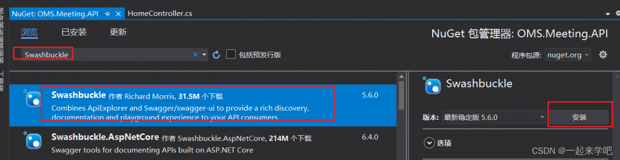 2、在搜索框中输入“Swashbuckle” ,选择Swashbuckle包后,点击安装