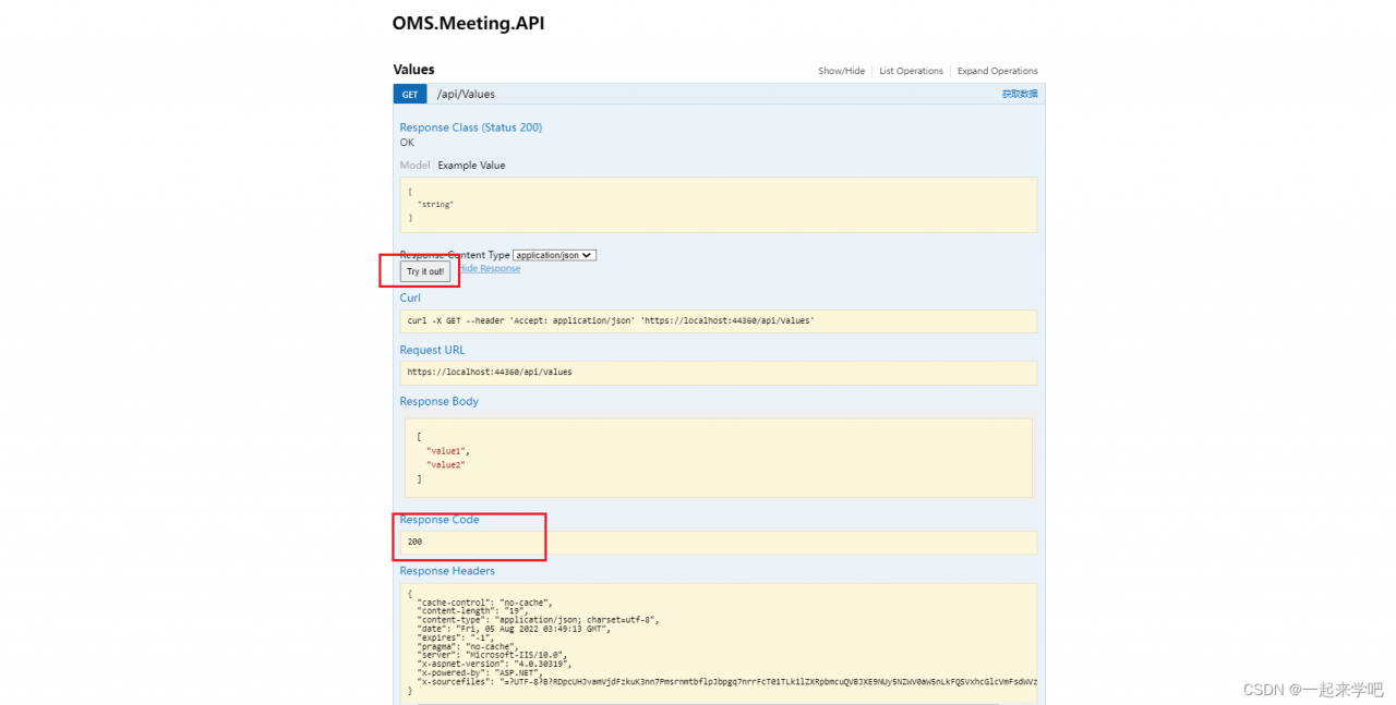 展开任意一个api接口,点击“try it out”即可看到最终请求结果