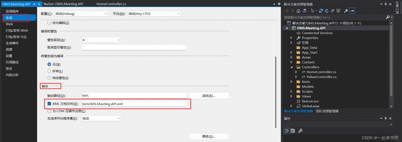 3、右键项目名称->属性->生成->输出->勾选“xml文档文件”
