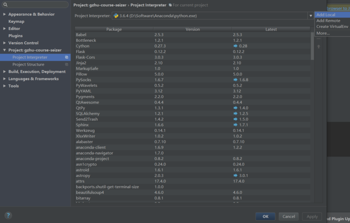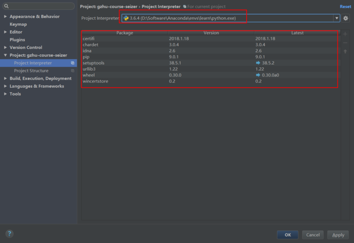 比如你要在learn环境中编写程序, 那么就修改为D:\Software\Anaconda\envs\learn, 可以看到这时候下面的依赖包也变成了learn环境中的包了.接下来我们就可以在pycharm中愉快的编码了.