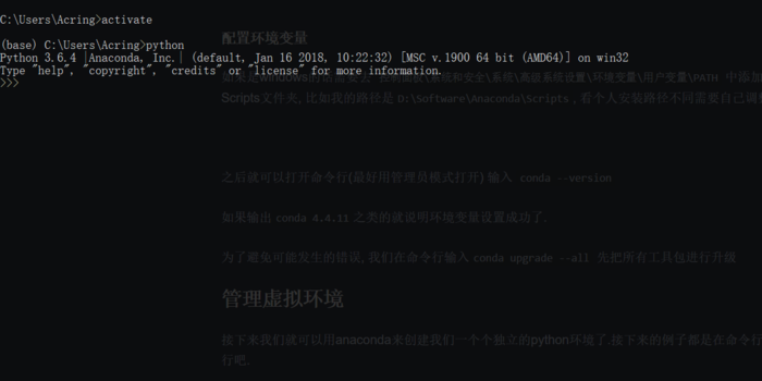 activate 能将我们引入anaconda设定的虚拟环境中, 如果你后面什么参数都不加那么会进入anaconda自带的base环境,