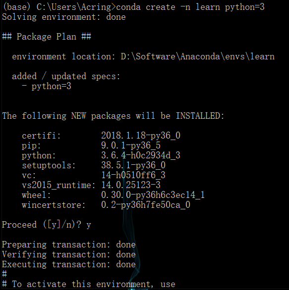 conda create -n learn python=3 // 创建一个名为learn的环境并指定python版本为3(的最新版本)