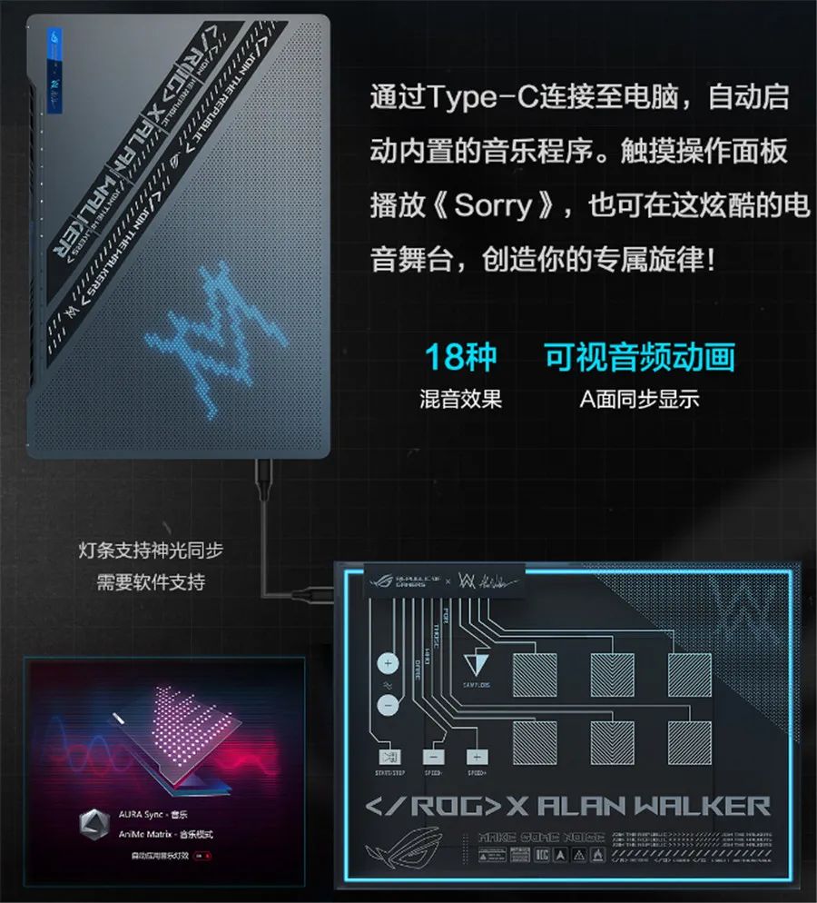 ROG Remix是Alan Walker在整个设计中最喜欢的部分,当手指放在电音盒上的那一刻起,便可以感受到令人惊艳的设计,这是一个极具创意的配件,只需用包装里的USB Type-C线将盒子连接到电脑上,它便摇身一变成为电音盒,用户可以触发Alan Walker原创的18种音效,可以选择弹奏内置的Alan Walker歌曲,或者将自己的曲子导入Remix软件,ROG Remix电音盒还可与AniMe Matrix™光显矩阵屏联动。