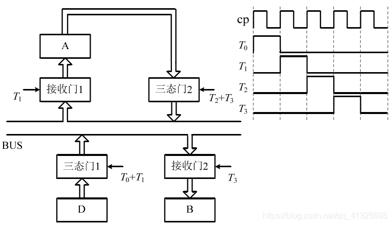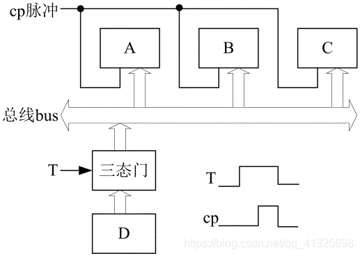 解:( 1 )由 T 打开三态门 将 D 寄存器中的内容送至总线 bus , 由 cp 脉冲同时 将总线上的数据 打入到 A 、 B 、 C 寄存器中。 T 和 cp 的时间关系如图 ( 1 ) 所示。
