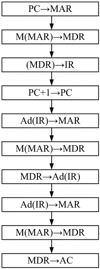 OP(IR) → CU , Ad(IR) → MAR , RD , MM → MDR , MDR → X , ADD , ALU → ACC , ACC → MDR , WR