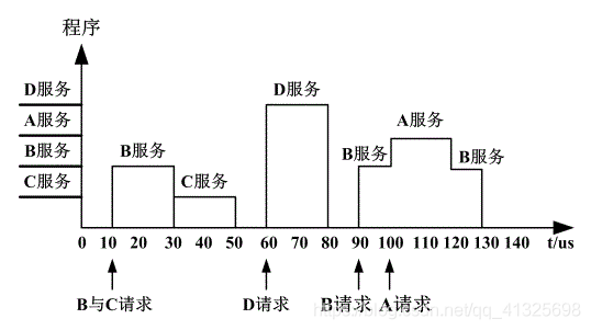 解: A 、 B 、 C 、 D 的响优先级即处理优先级。 CPU 执行程序的轨迹图如下: