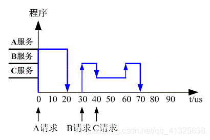 请按下图所示时间轴给出的设备请求中断的时刻,画出 CPU 执行程序的轨迹。设 A 、 B 、 C 中断服务程序的执行时间均为 20 s 。