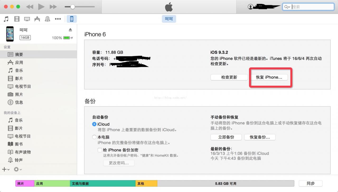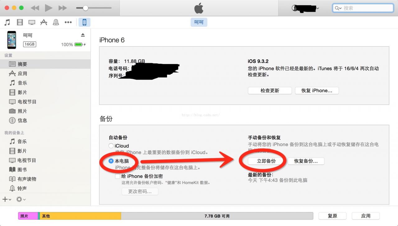 2.然后用iTunes备份该iPhone6