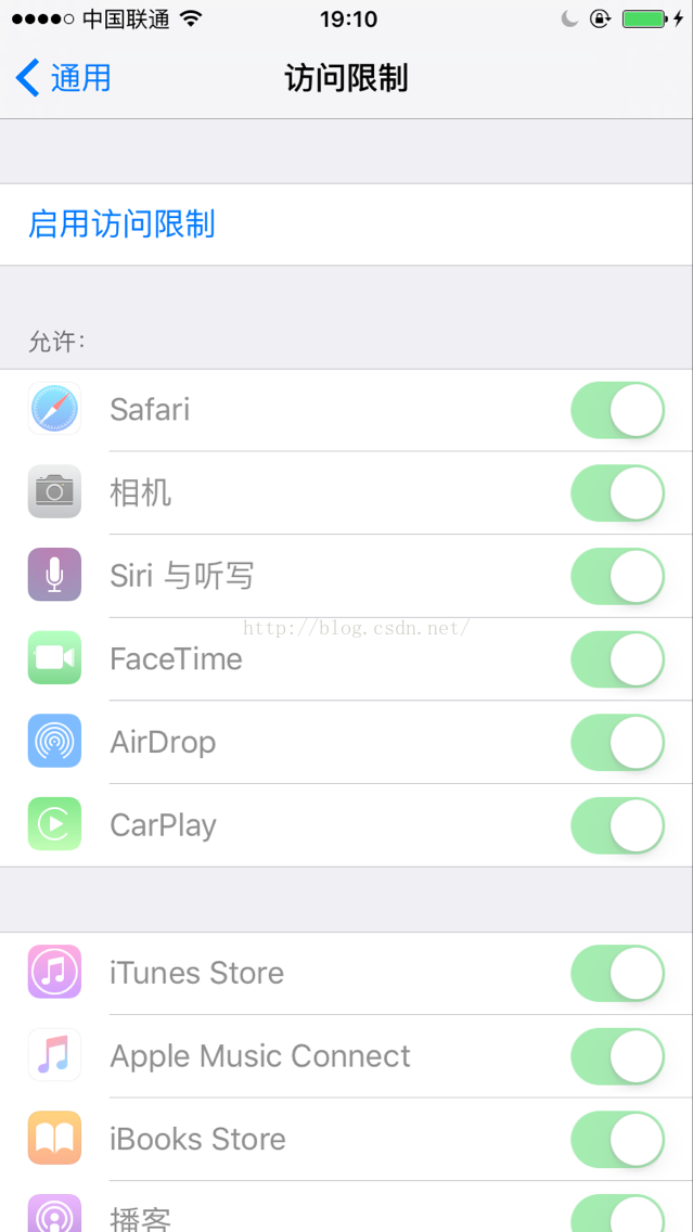 进入到:设置-->通用-->访问限制,界面如下,默认是关闭的。