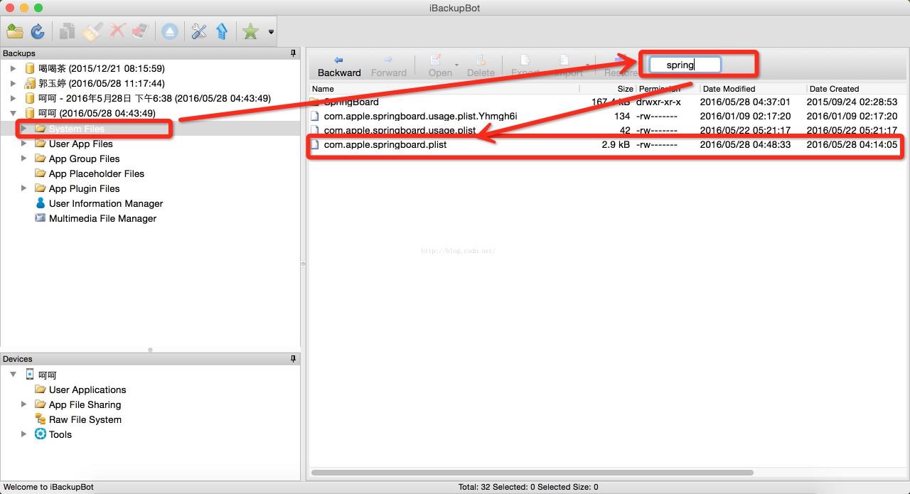 4.打开System Files,查找 spring ,这里会显示n个文件,找到com.apple.springboard.plist 文件并打开