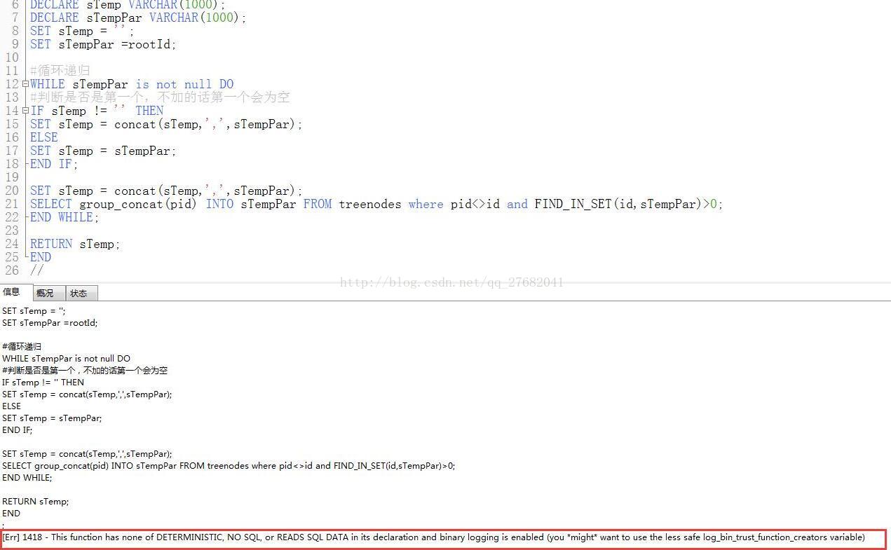 执行此语句:show VARIABLES like "log_bin_trust_function_creators";