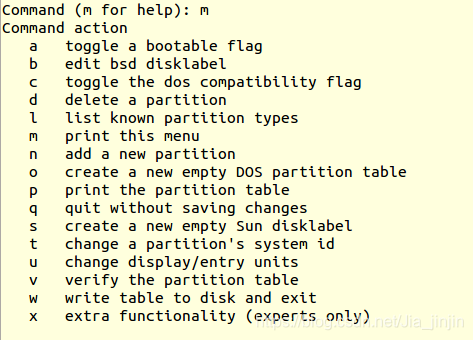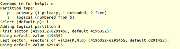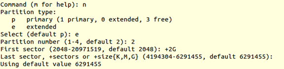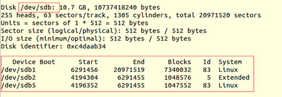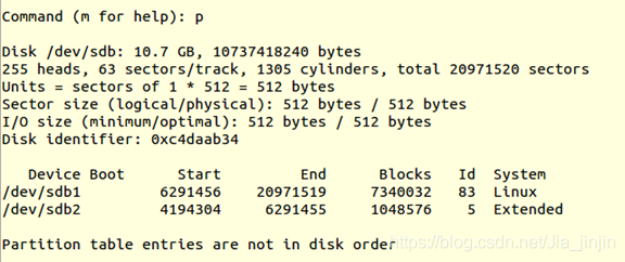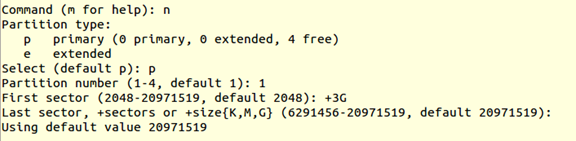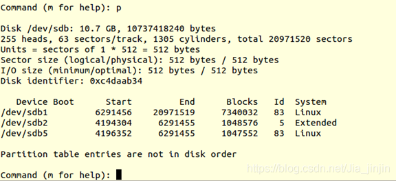 fdisk /dev/sdb m (m for help,查看命令含义) n (add a new partition,添加一个新分区) p (default p,默认为主分区) 1 (Partition number,分区编码) +3G (分区大小) P (print the partition table,打印分区表)