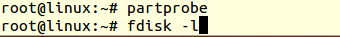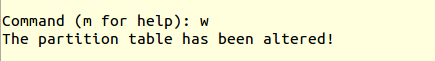 ● 输入子命令w,把设置写入硬盘分区表,退出fdisk并用partprobe让修改立刻生效。