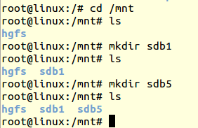 ● 利用mkdir命令,在/mnt目录下建立挂载点,sdb1和sdb5。