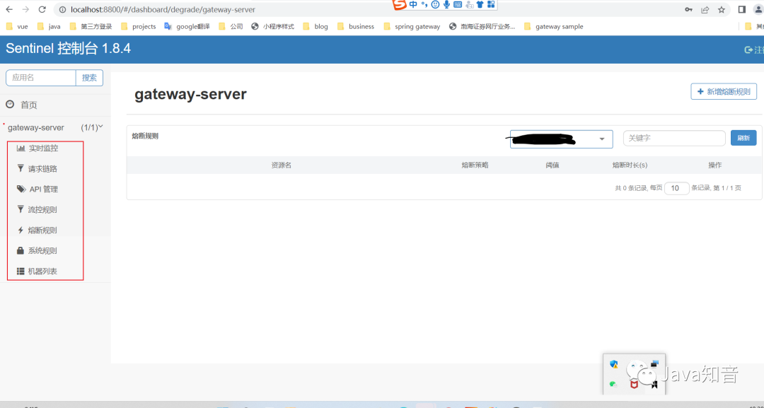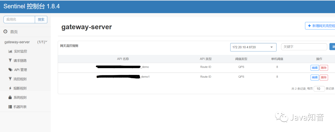 3、启动网关程序,可以在sentinel-bashboard控制台上面能够看见流控规则:注意,我涂掉的黑色部分一开始是没有的。