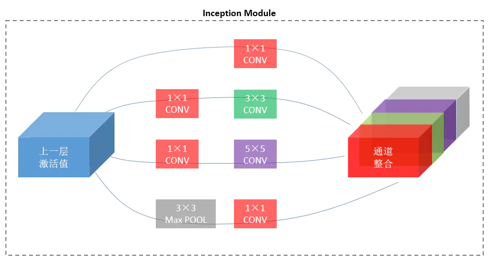 上面这个部分,称为“Inception Module”,而Inception Network,就是由一个个的inception module组成的: