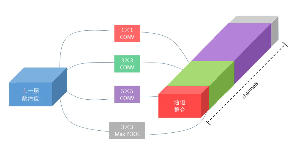 在sequential model中,所有操作,无论是CONV还是POOL,都是排成一些序列。但是Google他们就想,为什么不可以同时进行各种操作呢?于是论文的作者有一个大胆的想法,假如我们有3个CONV和一个MaxPOOL,何不让它们平行地运算,然后再整合在一起?: