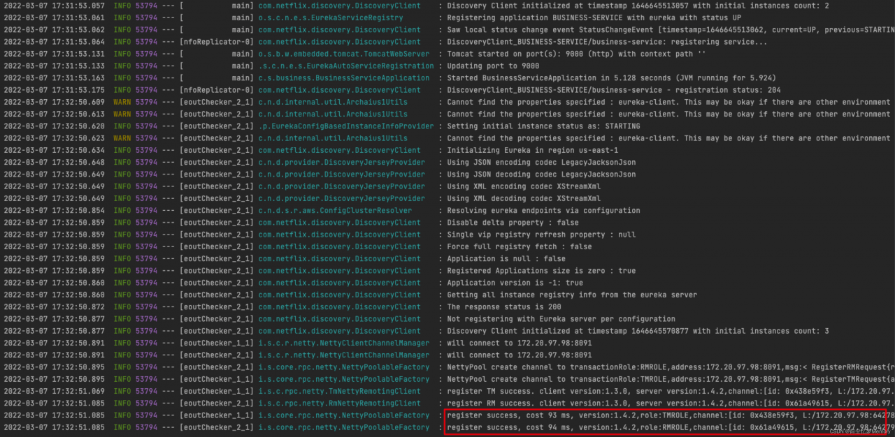 启动business服务,“register RM success. ”,表示RM已经注册到TC。