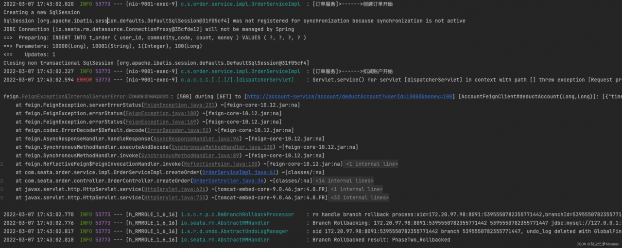创建订单的时候,在order服务调用account服务的时候发生了异常 ,下面日志可以看出,数据已经开始回滚。