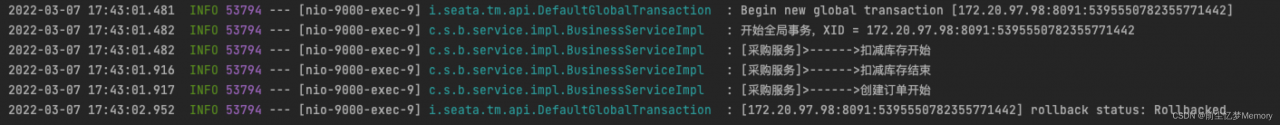 这次全局事务ID 172.20.97.98:8091:5395550782355771442,开启全局事务