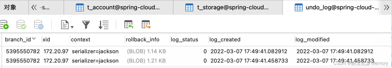 回滚的时候,是将之前保存的undo_log 取出来,进行数据恢复,在发生异常的地方,我们打上断点,再次请求,会发现undo_log表会将前面执行的日志保存下来