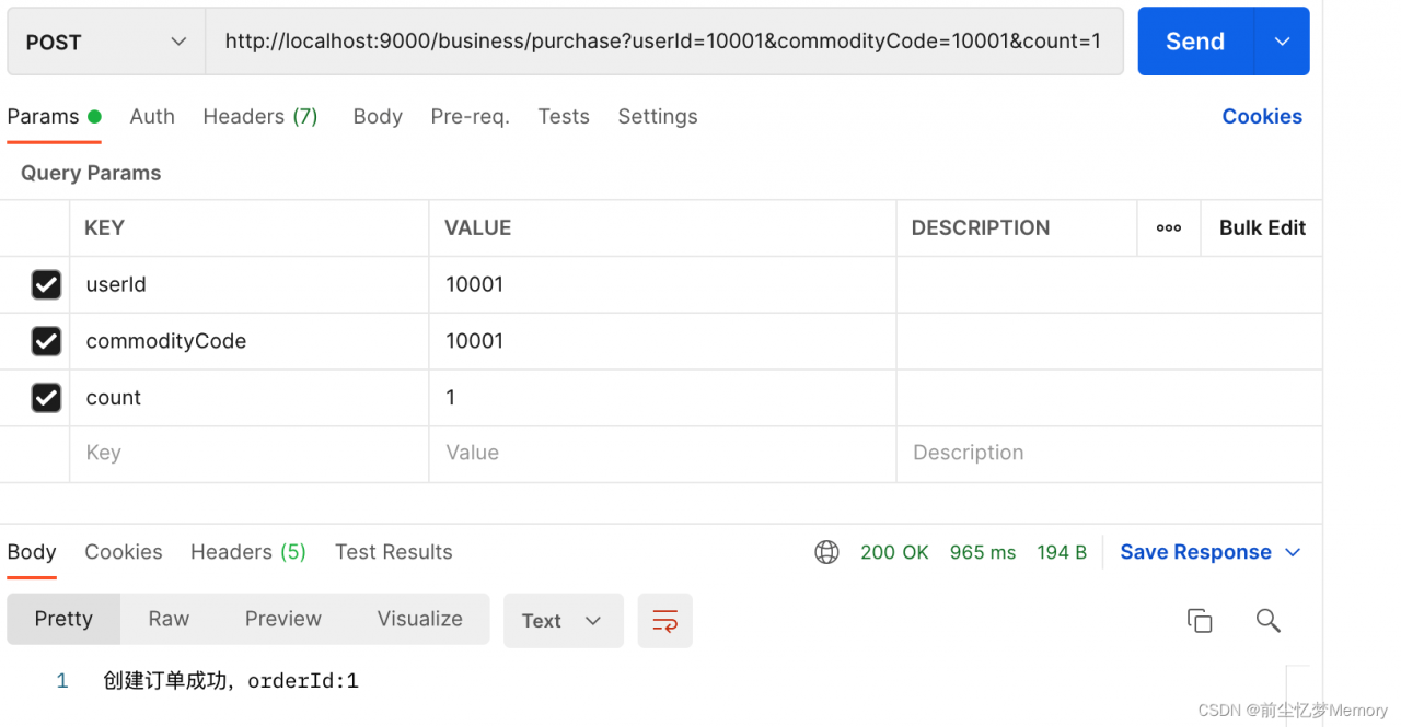 请求地址: http://localhost:9000/business/purchase?userId=10001&commodityCode=10001&count=1