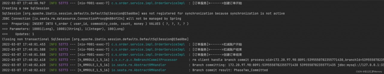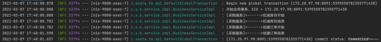 发起创建订单的请求后,日志里面可以清楚的看到本次全局事务的情况,