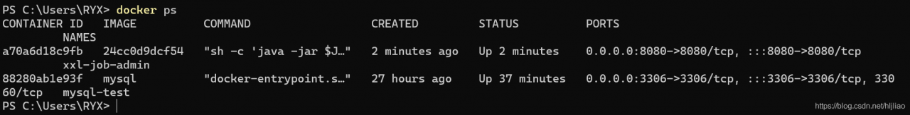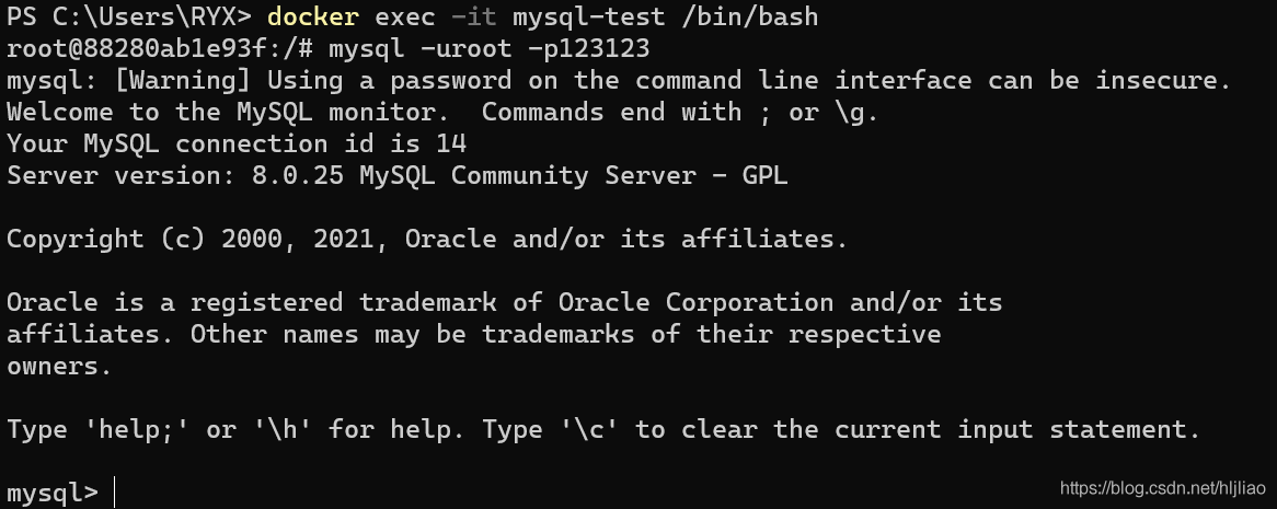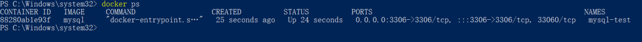 docker run -itd --name mysql-test -p 3306:3306 -e MYSQL_ROOT_PASSWORD=123123 mysqlMySQL是否启动成功