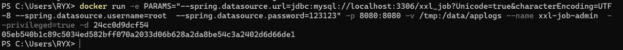 docker run -e PARAMS="--spring.datasource.url=jdbc:mysql://localhost:3306/xxl_job?Unicode=true&characterEncoding=UTF-8 --spring.datasource.username=root --spring.datasource.password=123123" -p 8080:8080 -v /tmp:/data/applogs --name xxl-job-admin --privileged=true -d 24cc0d9dcf54