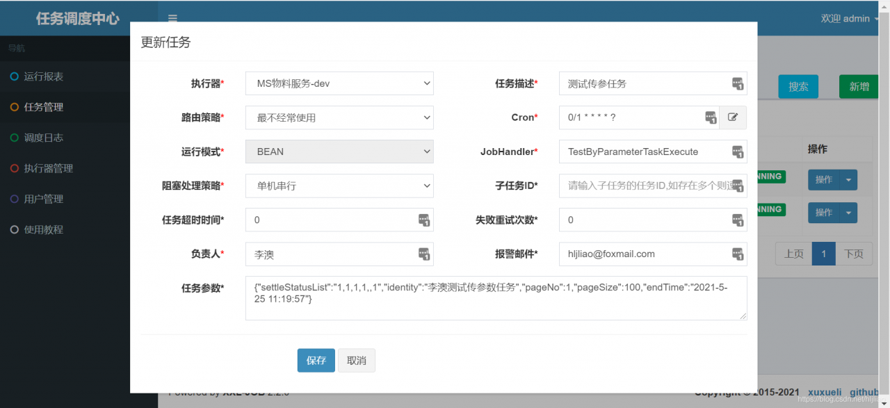 方法@XxlJob("TestByParameterTaskExecute")中的值对应xxljob任务管理中的JobHandler
