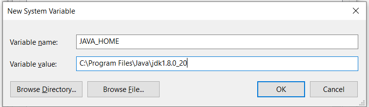 - 在“变量名”框中键入“ JAVA_HOME”,在“变量值”框中键入“ C:\ Program Files \ Java \ jdk1.8.0_20” JDK路径并保存。